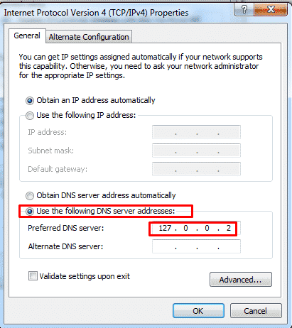Langkah terakhir adalah mengubah default DNS menjadi 127.0.0.2. Caranya :