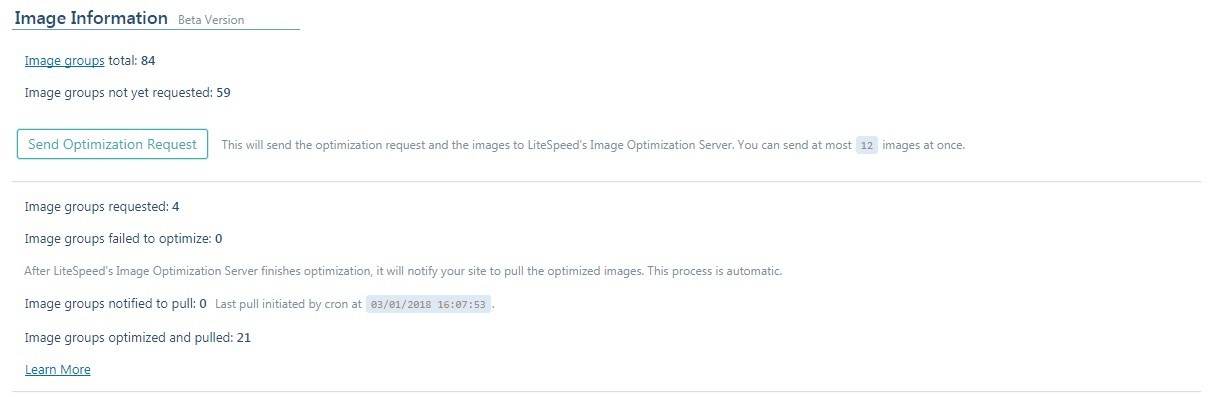 Image group requested artinya adalah grup gambar yang direquest untuk sekali request, image group failed berarti jumlah gambar yang gagal dioptimasi, image group notified to pull berarti berapa banyak gambar yang sudah dioptimasi dan siap untuk diletakkan di WordPress sedangkan image group optimized adalah jumlah grup gambar yang berhasil dioptimasi.